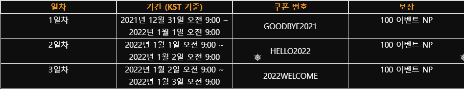 이터널리턴에서 연말부터 새해까지 매일 쿠폰으로 100NP씩 총 300NP를 쿠폰으로 지급합니다.