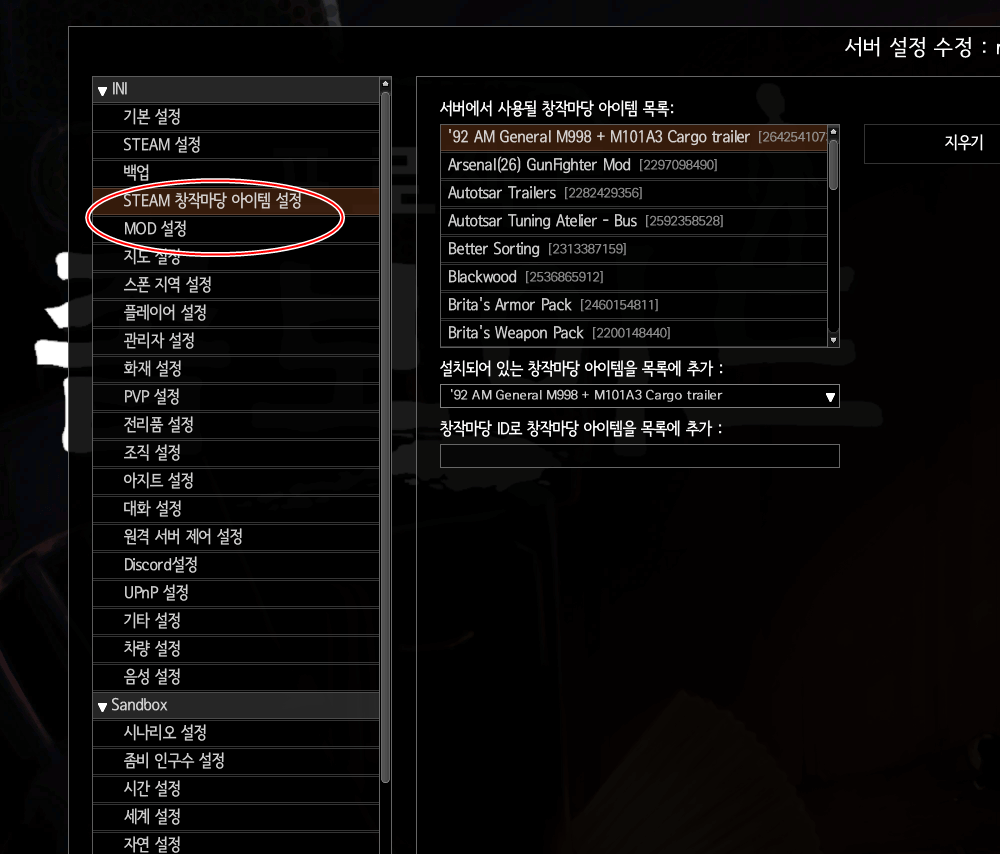 STEAM 창작마당 아이템 설정에 자신이 구독한 모든 모드를 추가해 주셔야합니다. 설치되어 있는 창작마당 아이템을 목록에 추가에서 하나씩 넣어주시면 됩니다. 그리고 나서 MOD 설정에도 모두 넣어줍니다.(아이템 설정을 하시고 나면 MOD설정이 자동으로 들어가 있는 경우가 있습니다)
