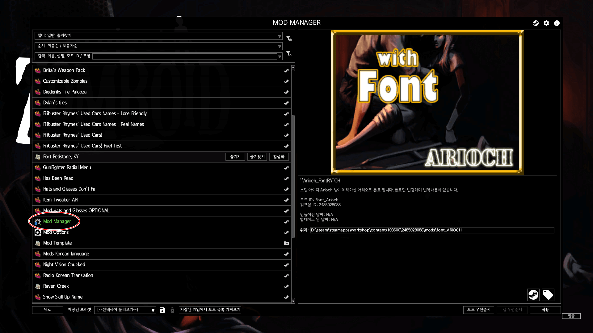 프로젝트 좀보이드 스팀 창작마당에 들어가셔서 자신이 원하는 모드를 구독하셔야 합니다. (직접 모드를 다운받고 폴더에 넣는 방법도 있습니다.) 일단 한국어 패치, 모드 한국어 패치, 모드 매니저는 설치하는 것을 추천드립니다. 특히 모드 매니저는 모드를 관리할 때 쓰기 때문에 무조건 설치해주세요.