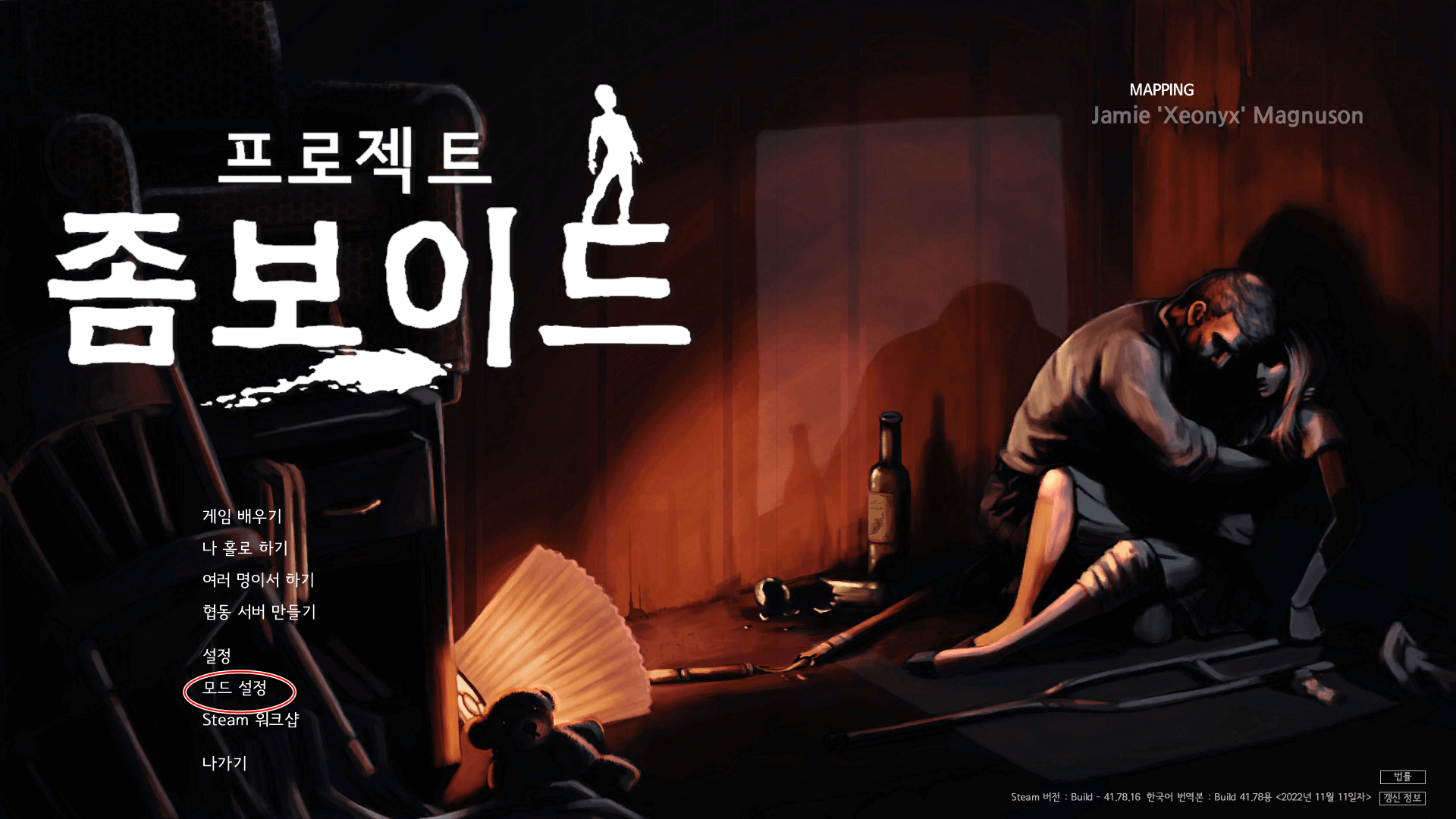 게임을 실행시키고 처음 화면에서 모드 설정을 눌러줍니다. 저는 한글 패치까지 완료하여 한글로 나오지만 처음에는 영어로 나올 수 있습니다.