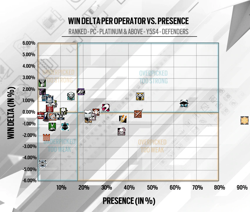 Zofia는 상단의 밸런스 조정 매트릭스에서 확인할 수 있듯이 두 번째로 출현 빈도가 높고 선호도도 높은 공격 대원입니다.
