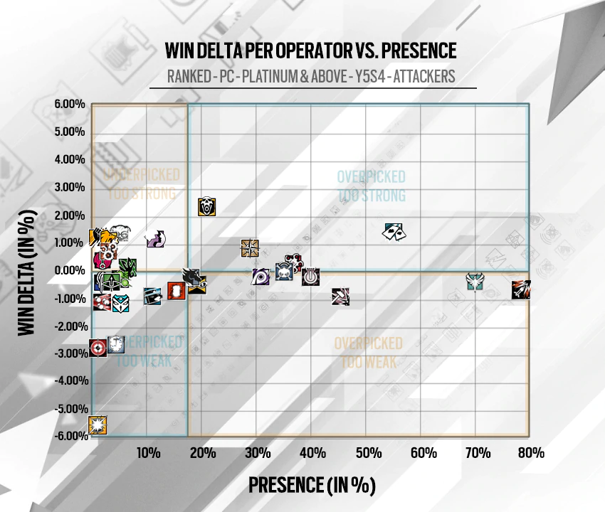 밸런스 조정 매트릭스에 따르면, Ash는 여러 방면에서 뛰어난 모습을 보이기 때문에 출현 빈도가 가장 높은 공격 대원입니다.