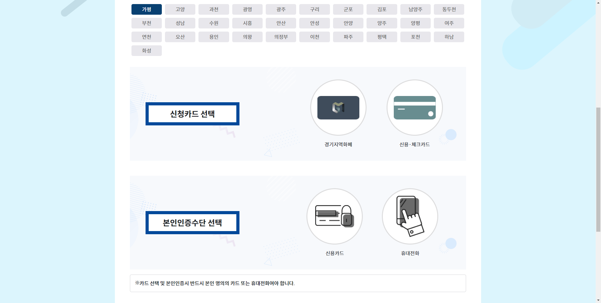 그럼 이제 자신이 살고 있는 지역을 클릭해주시고 신청 카드를 둘 중 하나를 선택하시고 본인인증수단도 하나를 선택해주세요.