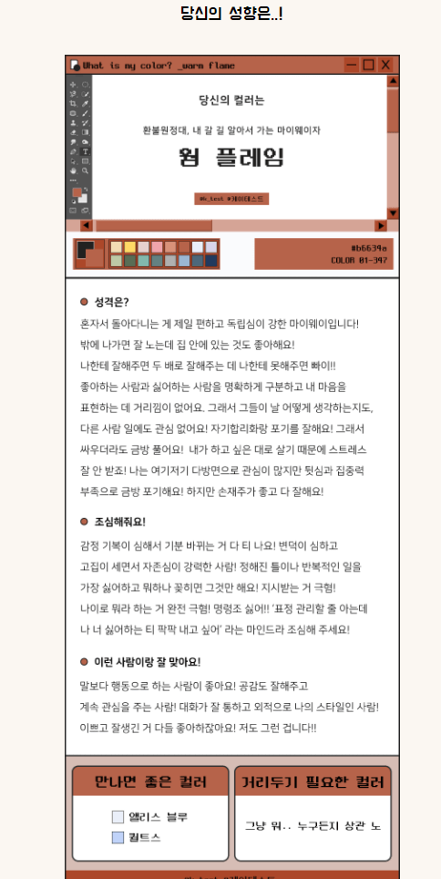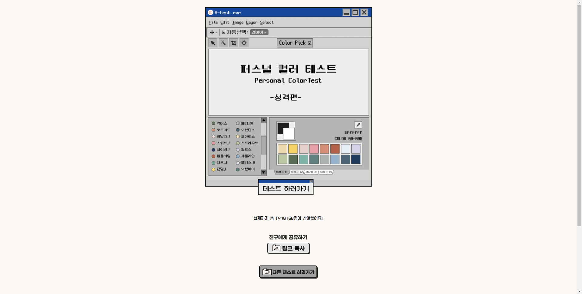 오늘은 퍼스널 컬러 테스트를 가져왔습니다. mbti처럼 질문으로 성격 테스트를 해서 색깔로 성격을 알려주는 테스트입니다.