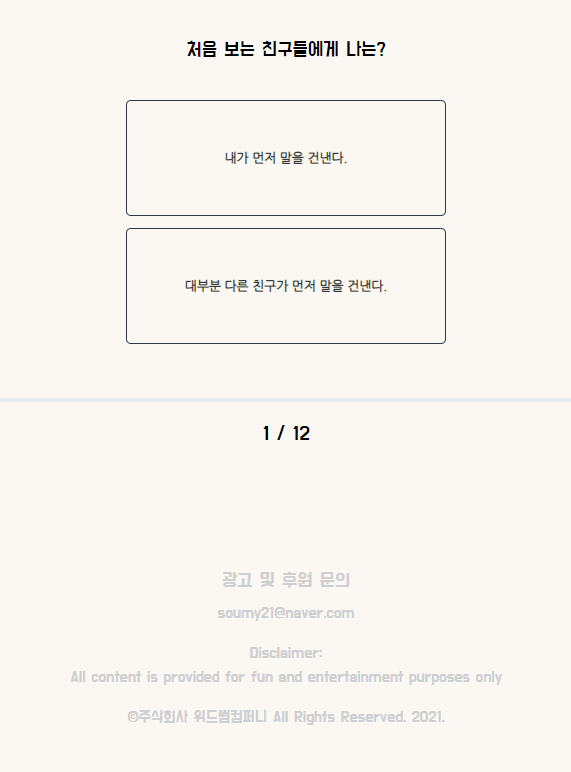 시작하자마자 나오는 테스트 질문 1번입니다. 이렇게 12번을 하시면 퍼스널 컬러 테스트를 완료하고 자신의 성격에 맞는 색깔이 나오면서 만나면 좋은 컬러와 거리두기가 필요한 컬러를 알려줍니다.