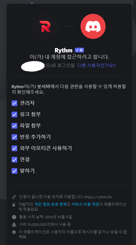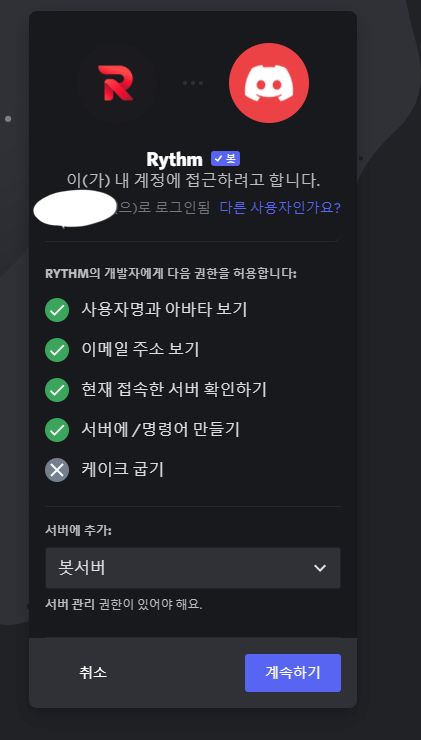 Rhythm봇을 추가하면서 봇에게 권한을 어느 정도 허용할 것인지 정하고 승인을 눌러주세요.