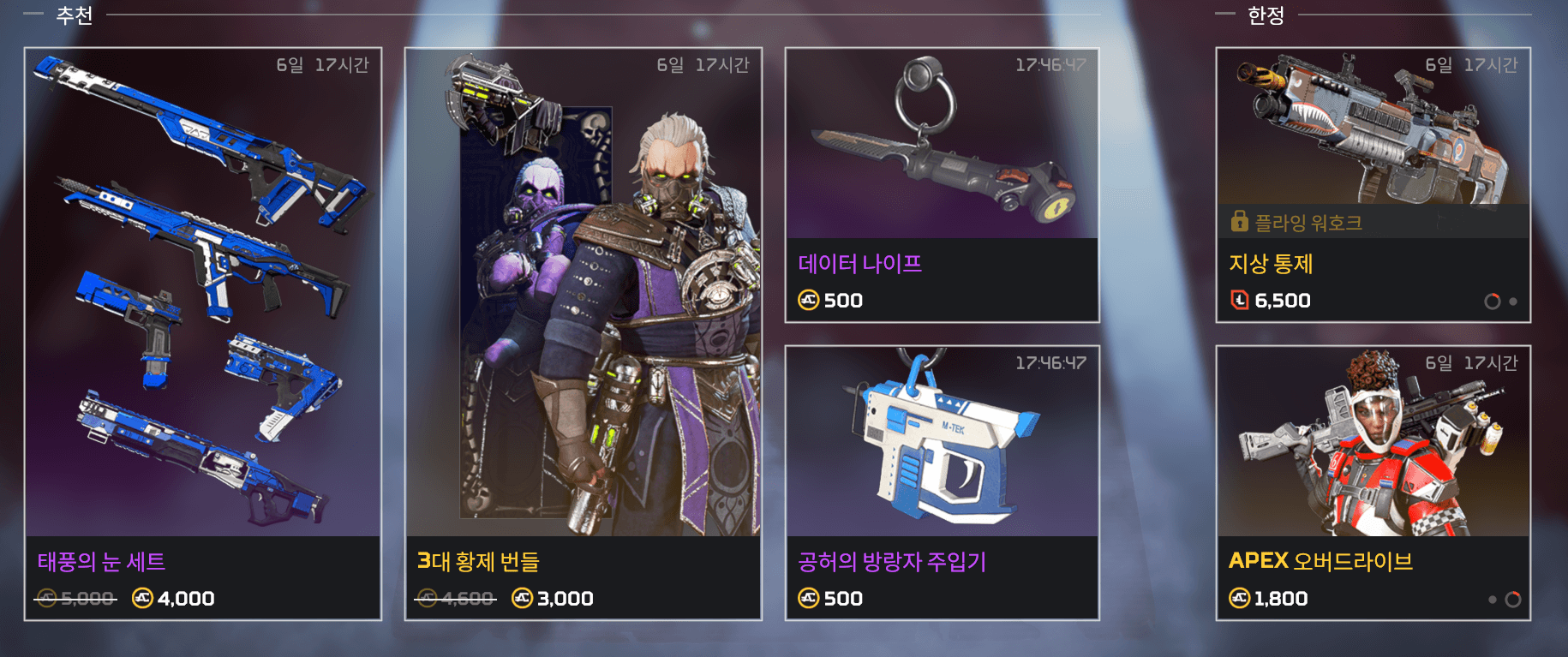지금 상점에서 팔고 있는 스킨들입니다. 기간은 6월 17일까지 구매가 가능합니다.