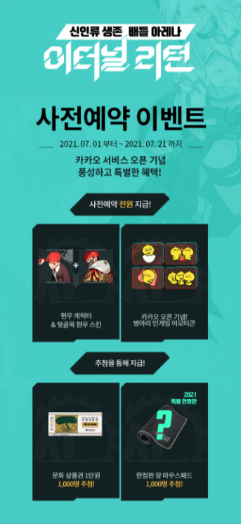 이터널 리턴(블랙서바이벌)이 카카오 서비스를 시작하면서 7월 1일부터 7월 21일까지 사전예약 이벤트를 진행합니다.