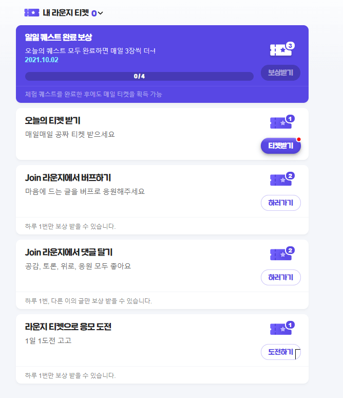 처음 시작하면 보너스 티켓이 존재하고 그 미션을 전부 클리어하시면 일일 미션이 나옵니다.