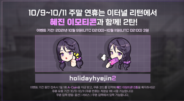 이벤트 기간에 하루마다 700, 900 1100 코인을 지급하며 쿠폰을 등록하면 혜진 이모티콘을 지급합니다.