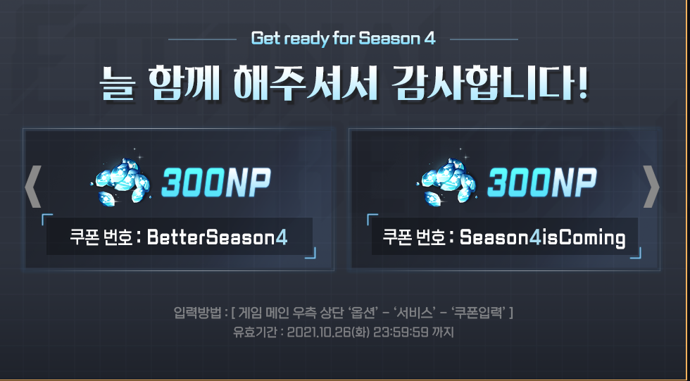 이터널리턴 시즌4 기념 무료 NP300 쿠폰 2개이터널리턴 시즌4 기념 무료 NP300 쿠폰 2개