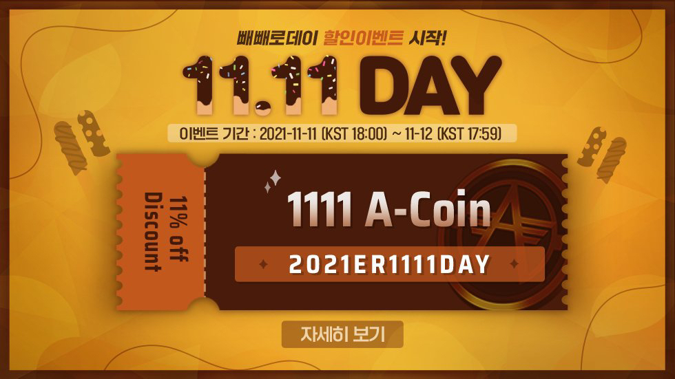 11월 11일 빼빼로 데이 시즌 패스 이벤트를 시작함과 동시에 11월 11일 빼빼로 데이 기념 쿠폰으로 1111A-Coin을 지급합니다.